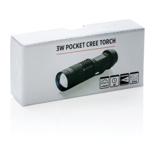 Compact but super bright 3W CREE torch that can easily be taken wherever you go because of its compact size. Includes batteries for direct use. 85 lumen and working time of about 4 hours. Made out of durable aluminium.