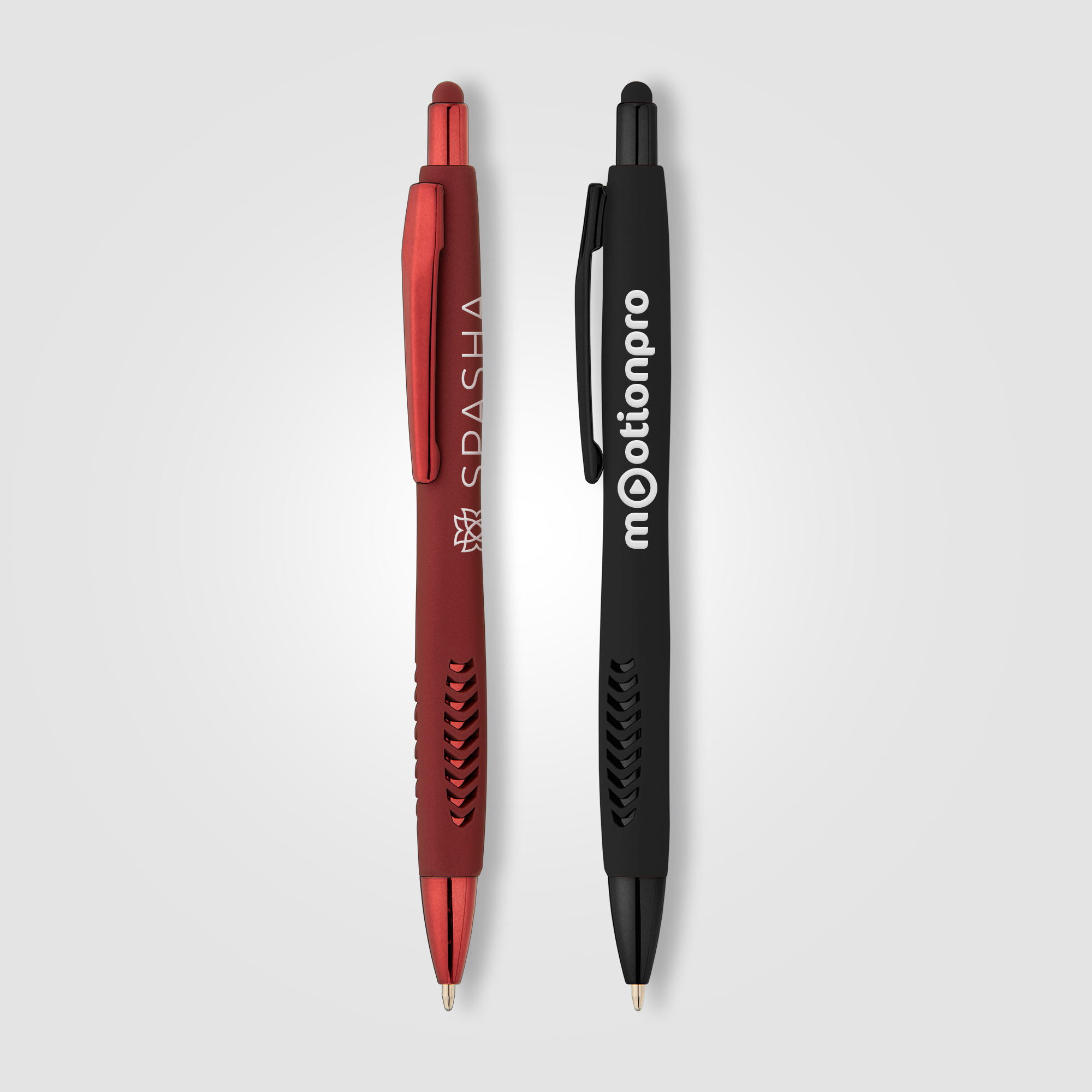 Advertise on a monochrome pen that has style in every detail. Your customers will appreciate the rubberized finish that creates a matt look and soft feel. The contoured barrel shape and cut-out design detail at the grip give this pen added appeal. The streamlined look includes professional barrel colours and colour-matched trim, making the perfect background for your branding.