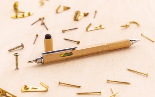 Multifunction bamboo pen with ruler (7cm) , spirit level, screw driver, stylus tip and ballpoint with blue writing ink (up to 400m) Made out of bamboo material with aluminium clip.