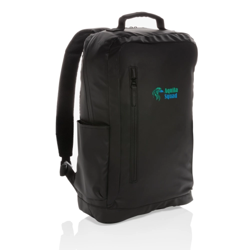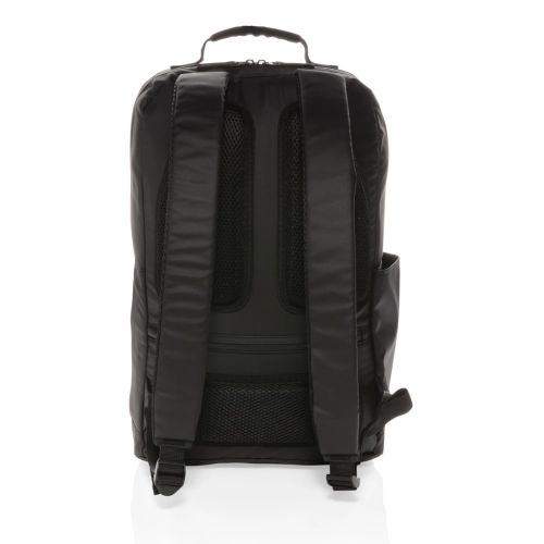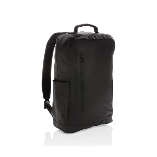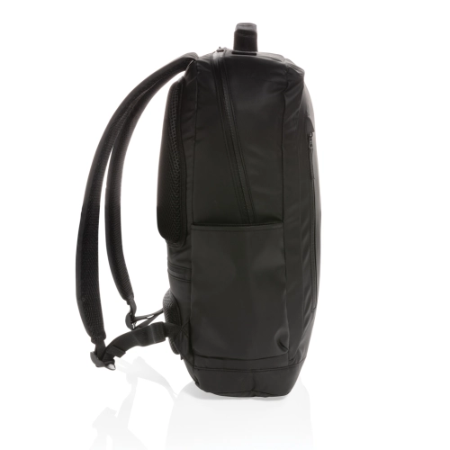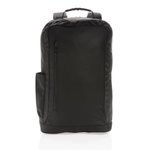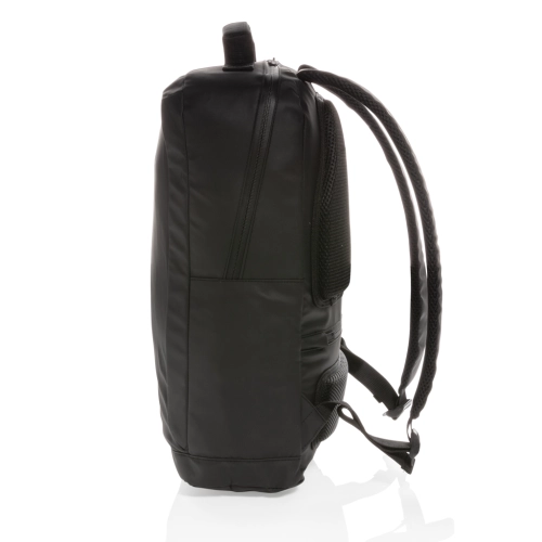 Look effortlessly stylish when carrying this all black laptop backpack. This bag holds a roomy compartment for all your gear and a laptop compartment that can hold a 15.6" laptop. PVC free.