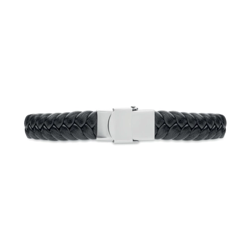 Braided faux leather cuff bracelet with polished steel hardware. Push-lock clasp. Wrist circumference: 21 cm.