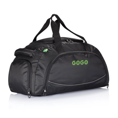 600D ripstop, zippered front pocket with organisers inside, side pocket, shoe pocket, webbing handles and shoulder strap, 4 stand feet on base, PVC free.