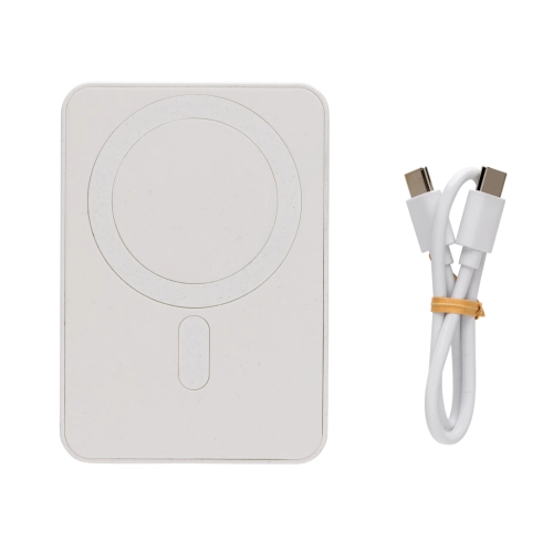 5.000 mAh pocket size powerbank with 5W magnetic wireless charger with a case made out of RCS certified recycled ABS plastic. RCS (Recycled Claim Standard) is a standard to verify the recycled content of a product throughout the whole supply chain. Total recycled content: 20 % based on total item weight.The powerbank contains a long lasting grade A 5.000 mAh lithium polymer battery. The power indicators will indicate the remaining energy level so you always know when to re-charge.; Type-C Input 5V/2.4A; Type C output:5V/2A.4A Item and accessories PVC free. Including RCS certified recycled TPE charging cable. Packed in FSC® mix packaging.
