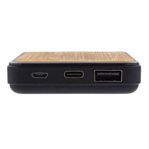 5.000 mAh pocket powerbank made with RCS (Recycled Claim Standard) certified recycled ABS material with soft touch finish and FSC® certified bamboo. Total recycled content: 23 % based on total item weight. RCS certification ensures a completely certified supply chain of the recycled materials. When fully charged it will provide you with enough energy to re-charge your mobile phone up to three times. The powerbank contains a long-lasting grade A 5.000 mAh high density lithium polymer battery. The power indicators will indicate the remaining energy level so you always know when to re-charge. Type-C input 5V/2A Micro USB Input 5V/2A. Output 5V/2A. Packed in FSC® mix packaging. Including RCS certified recycled TPE charging cable
