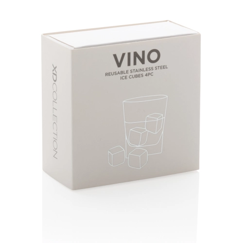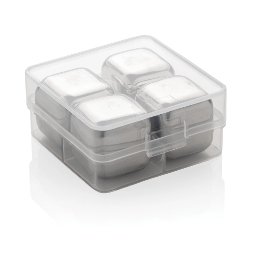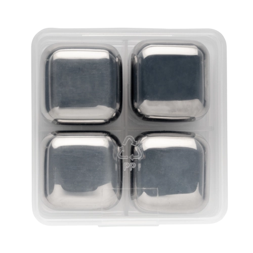 Enjoy your chilled drink with this set of 4 stainless steel ice cubes. The cubes help preserve the taste of your favourite drink with no dilution. The set comes in a handy storage box.They are simple to use: just store them in your freezer and they are ready to use in just 3 hours! Size of the cube 2.5x2.5x2.5cm.