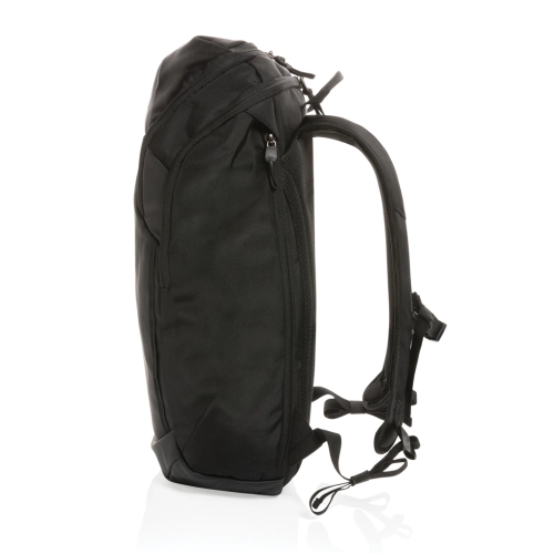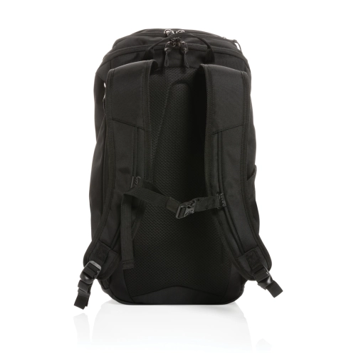 Swiss Peak AWARE™ RPET 15.6 inch business backpack is a weather-resistant backpack for work and everyday adventures. The backpack features a roomy main compartment and on-the-go quick access to your laptop via the side zipper. Comfortable to wear thanks to the contoured, breathable shoulder straps, padded back panel and fully adjustable chest trap. A top zipper pocket holds all your daily essentials. The exterior is made with PU and 1200D recycled polyester. The lining is made with 100% 150D recycled polyester. With AWARE™ tracer that validates the genuine use of recycled materials. Each bag has reused 38.19 0.5L PET bottles. 2% of proceeds of each product sold containing AWARE™ will be donated to Water.org.