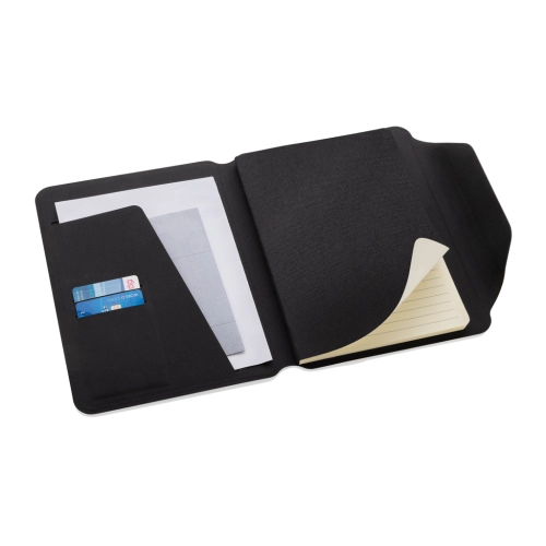 The Teri AWARE™ RPET and Walnut A5 Portfolio is the perfect blend of professional style and functionality. Crafted from rPET with AWARE tracer, this portfolio features a walnut wood emblem for added elegance. It has a magnetic closure, ensuring secure storage for your essentials. Inside, you’ll find two business card slots and an A5 document sleeve pocket. The A5 notebook, made with FSC® mix paper, offers 64 sheets (128 pages) of cream-colored, lined paper. The portfolio is packaged in an FSC® mix Fefco 427 gift box, making it an ideal choice for both personal use and gifting. Made with recycled polyester embedded with the AWARE™ tracer. 2% of proceeds of each product sold with AWARE™ will be donated to Water.org. PVC free.