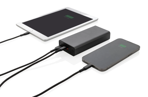 Ultra-fast charging powerbank made with RCS (Recycled Claim Standard) certified recycled aluminium and ABS. Total recycled content: 21% based on total item weight. RCS certification ensures a completely certified supply chain of the recycled materials. Aluminium does not lose its characteristics in the recycling process and can be recycled endlessly. The powerbank contains a long-lasting grade A 20.000 mAh lithium polymer battery. The C output port support fast charging up to 18W and also fast re-charging within 5 hours. With dual USB A output ports. Power indicators will indicate the remaining energy level so you always know when to re-charge. Item and accessories 100% PVC free. Including type C charging cable made from RCS certified recycled aluminium, TPE and PET. Packed in FSC® mix packaging. Approved for airline carry on (74 Wh). USB output 5/3A, 9V/2A. 12V/1.5A. Type C output: 5V/3A, 9V/2A, 12V/1.5A. Type C input: 5V/3A, 9V/2A, 12V/1.5A. Micro USB input: 5V/2A, 9V/2A, 12V/1.5A.