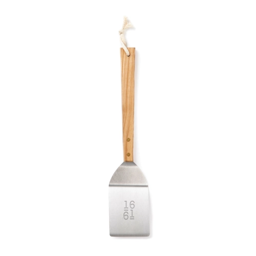 A solid stainless steel spatula, perfect for frying fish or pizza. Ash wood handle.