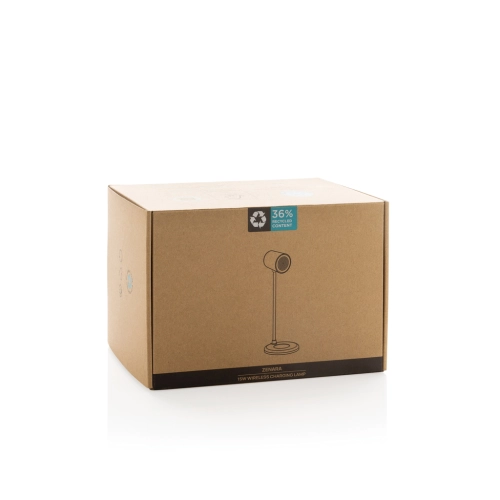 Ultra-fast 15W wireless charger with integrated desk lamp. The flexible desk lamp provides 55 lumen and has 3 light modes (warm, white and hybrid) Made with RCS recycled ABS, recycled PC and FSC Cork. Wireless charging compatible with Android latest generations, iPhone 8 and up. Item and accessories PVC free. Including 120 cm type C charging cable made from RCS certified recycled TPE. Packed in FSC® mix kraft box.. Type-C in; Input 5V/2A; 9V/2A;12V/1.5A; Wireless output 5V/1A;9V/1.1A; 9V/1.67A (15W) Total recycled content: 36 % based on total item weight. RCS certification ensures a completely certified supply chain of the recycled materials.